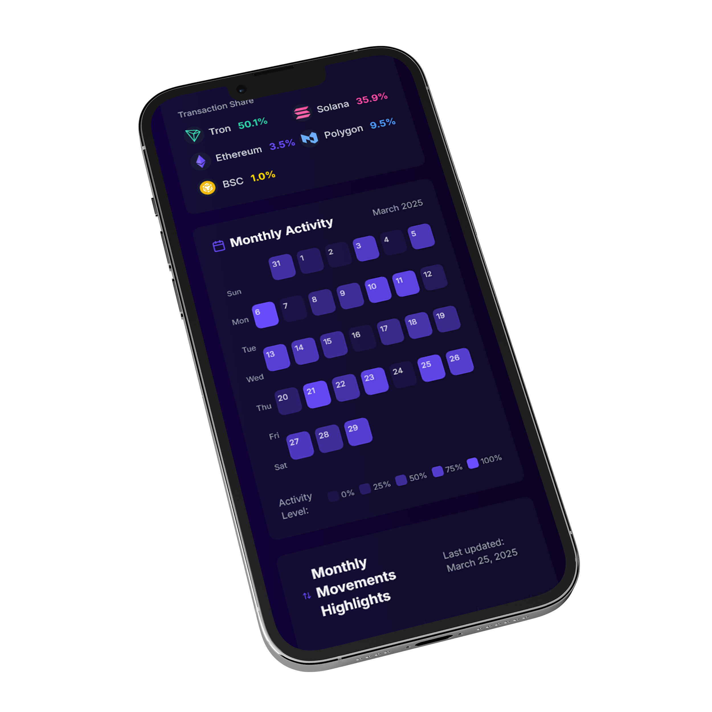 An image of a single phone featuring a design from the DeFi Metrics website and app, designed and built by Innisfil Web Design.